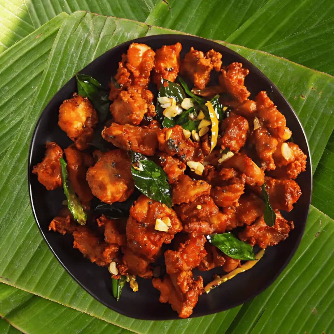 The chicken is deep-fried until crispy on the outside and tender inside, then tossed with curry leaves, green chilies, and a hint of garlic for extra flavor.